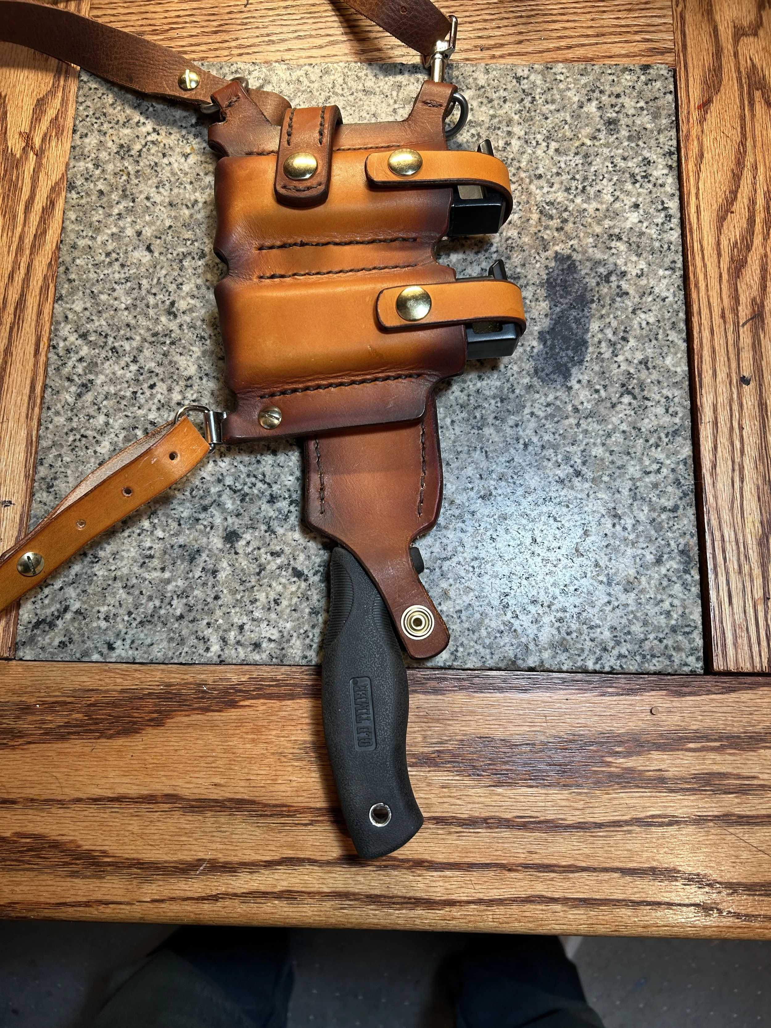 One function is to counterweight the weapon, so double or triple is recommended. As with the standard version there is a quick release clip to make it easy to take the shoulder holster off. In addition, this mag holder can come with a modification to allow you to add a custom knife sheath. The sheath is designed so all you need to do is grip the knife handle and pull down to open the retention snap to draw the knife.